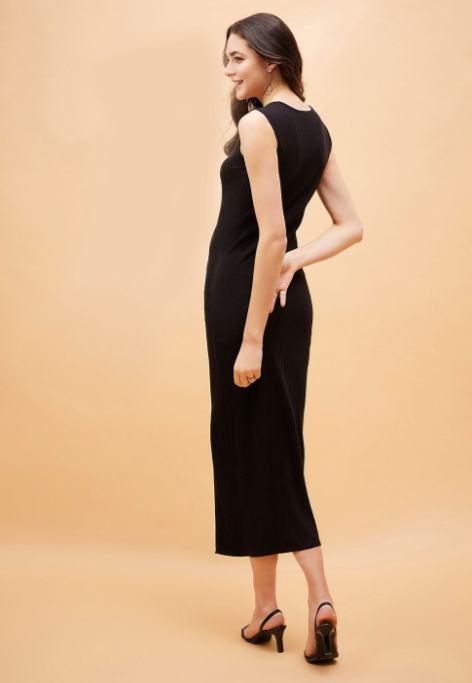 Black self design bodycon dress Shoulder straps Sleeveless, no sleeves Midi length in straight hem Knitted fabric